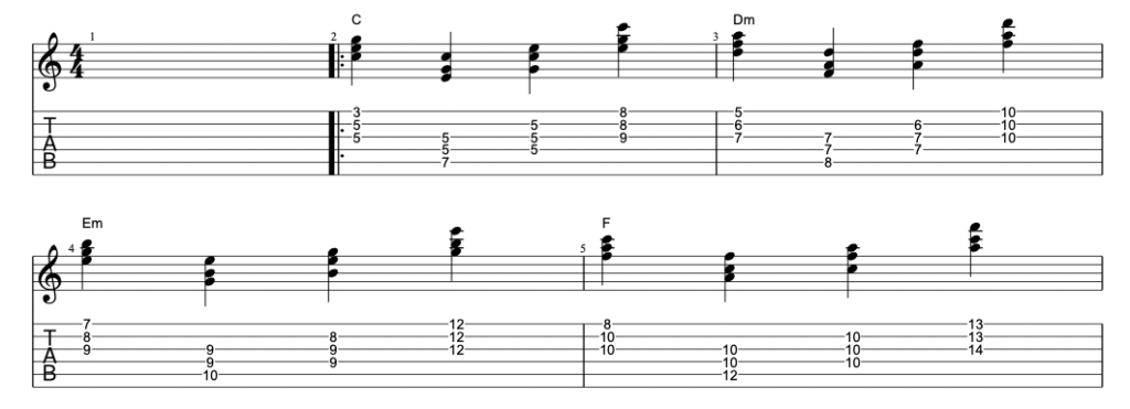 Here is a small etude with simple rhythm using some of the triads across the fretboard in the key of C. Try playing it! ( full etude and much much more in the course! )