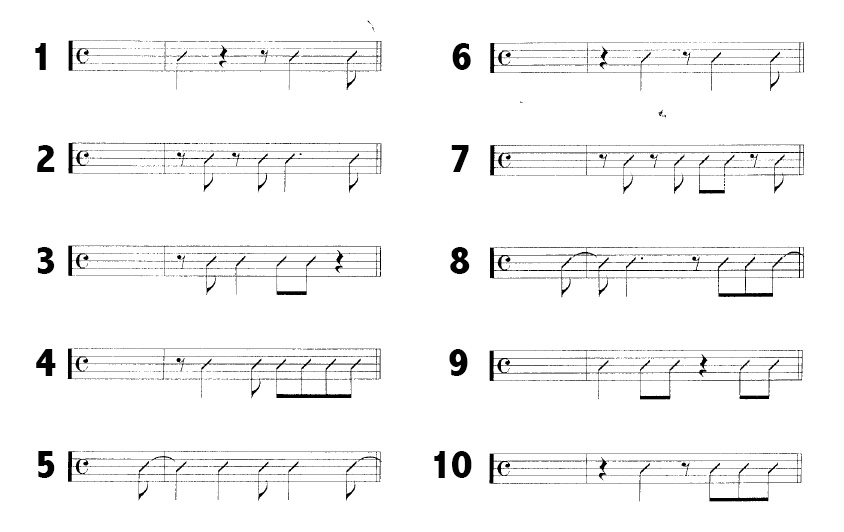 So the rhythm sheet can be used in 1000 creative ways. I usually say to student to just start with 1 rhythm and play it on one note. But really focus on timing. Then, play it on 2 notes. Then 3… Let me give you an example…
